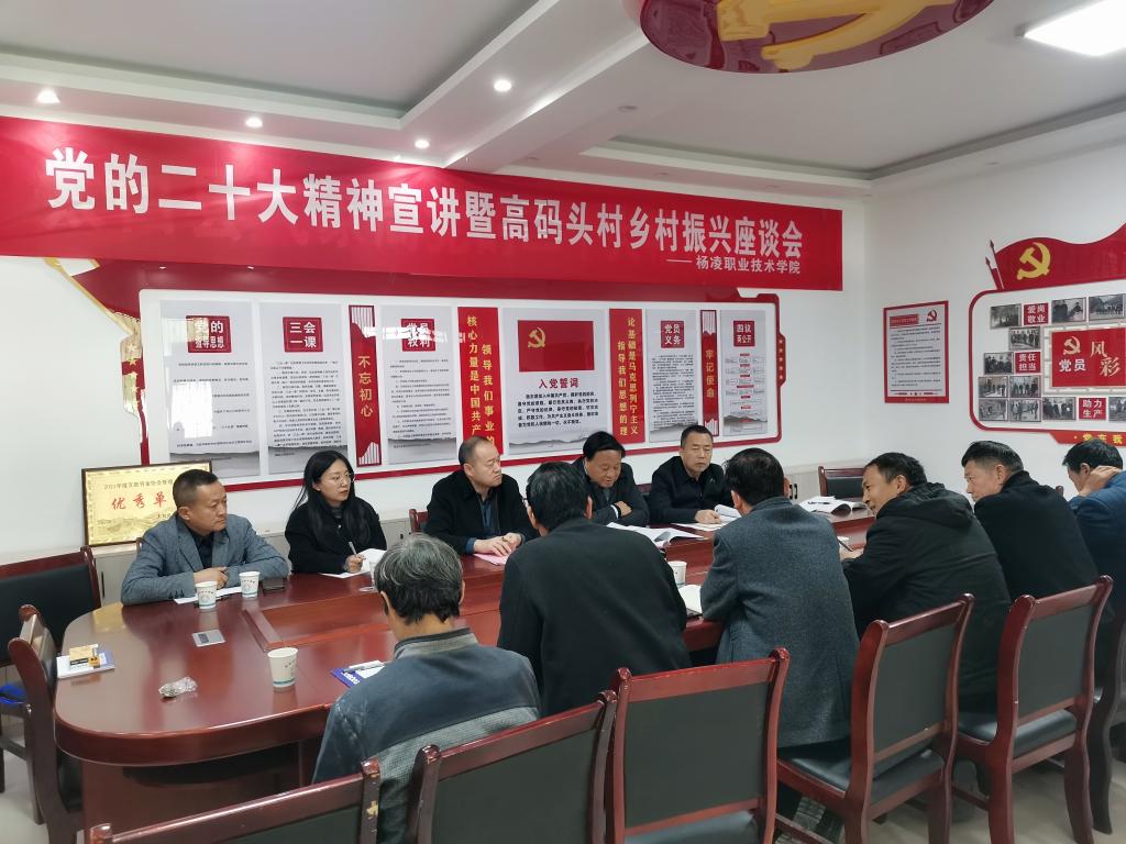 11月15日上午,我校党委书记王周锁赴太白县鹦鸽镇高码头村宣讲党的二十大精神,并调研乡村振兴工作。副校长胡俊鹏,科技与教育研究处处长冯旭,以及我校派驻高码头村驻村干部及专家参加相关活动。