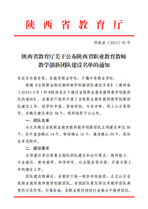 入选团队涵盖了我校优势专业和特色专业,充分展现了学校在不同学科领域的深厚底蕴和创新活力,标志着学校在职业教育教师团队建设方面取得了显著成效。学校历来高度重视教师教学创新团队建设,将其作为职业教育改革和教师队伍建设的重要抓手,将以此为契机,继续支持各团队围绕教师能力、专业建设、教育教学、科学研究和社会服务等内容开展为期两年的建设工作,进一步完善国、省、校三级团队建设体系,推动职业教育高质量发展,为地方经济社会发展培养更多高素质技术技能人才。