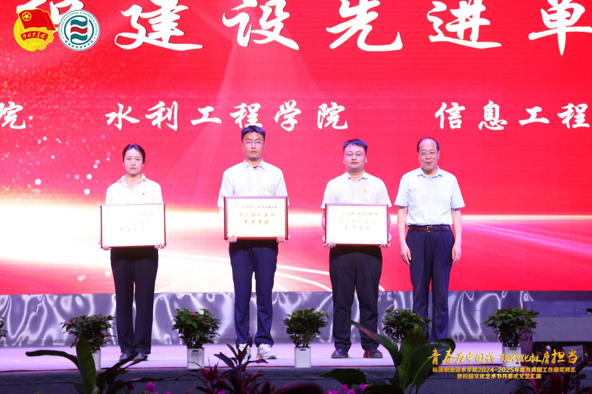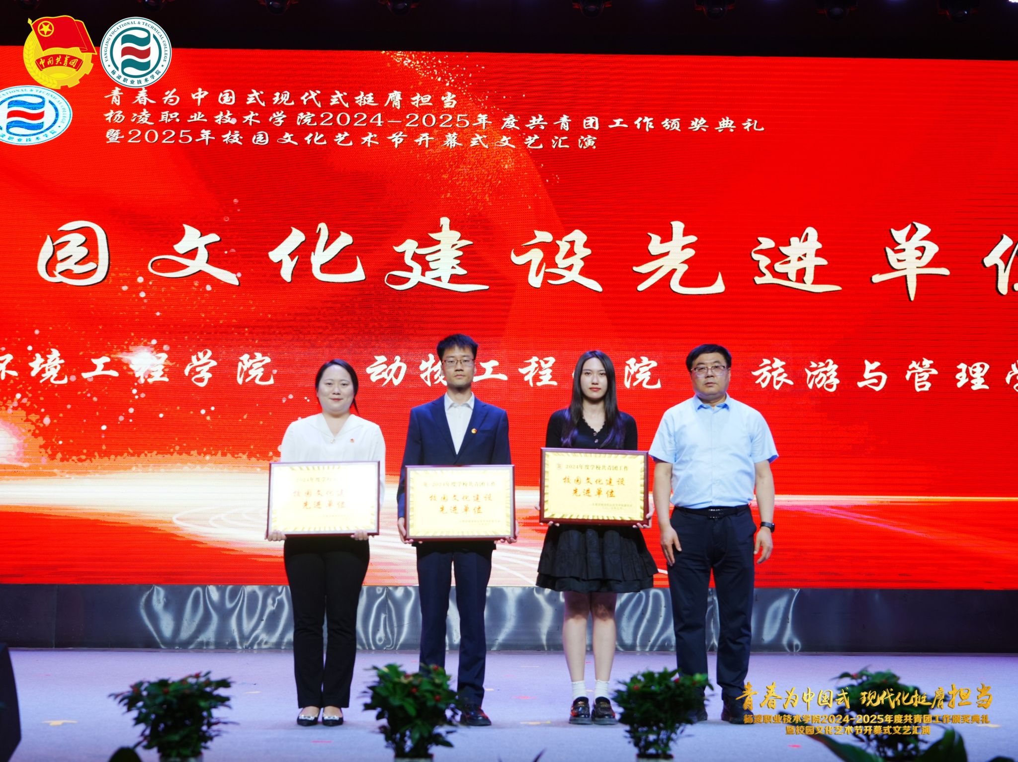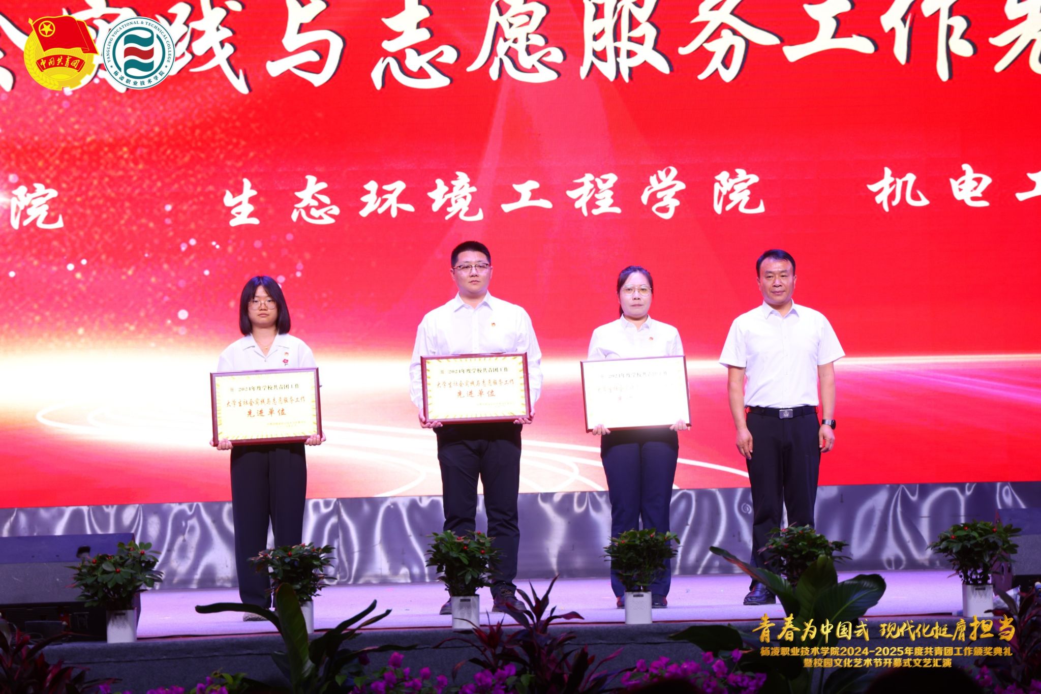 在颁奖典礼上,副校长张朝晖致辞全校青年团员,希望大家胸怀凌云之志,锻造过硬本领,做挺膺担当的奋斗者。典礼宣读了《共青团杨凌职业技术学院委员会关于表彰2024-2025学年度先进集体及先进个人的决定》,学校领导为五四红旗团委、五四红旗团支部、优秀共青团干部、优秀共青团员等先进集体和个人颁发奖章。