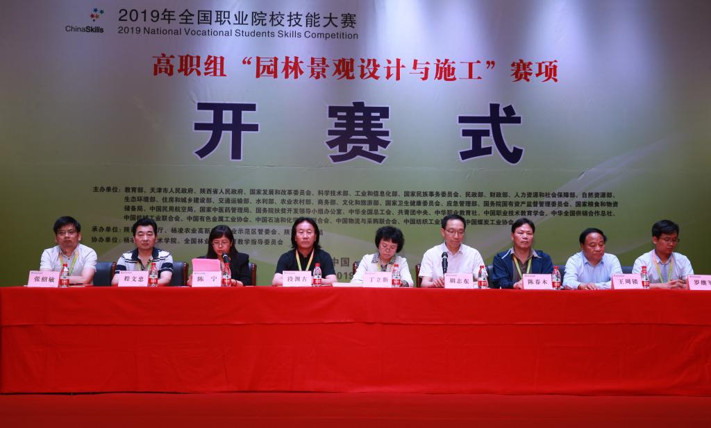 国家林业和草原局人事司巡视员丁立新讲话,并宣布2019年全国职业院校技能大赛(高职组)“园林景观设计与施工”赛项正式开赛。国家林业和草原局人事司教育培训处调研员张绍敏,赛项专家组组长、西北农林科技大学风景园林艺术学院院长段渊古,赛项裁判长陈春木,赛项执委会副主任、我院党委书记陈宁,赛项执委会副主任、我院院长王周锁出席开赛仪式。开赛仪式由赛项执委会副主任、全国林业职业教育教学指导委员会副主任、国家林业和草原局职业教育研究中心常务副主任胡志东主持。
