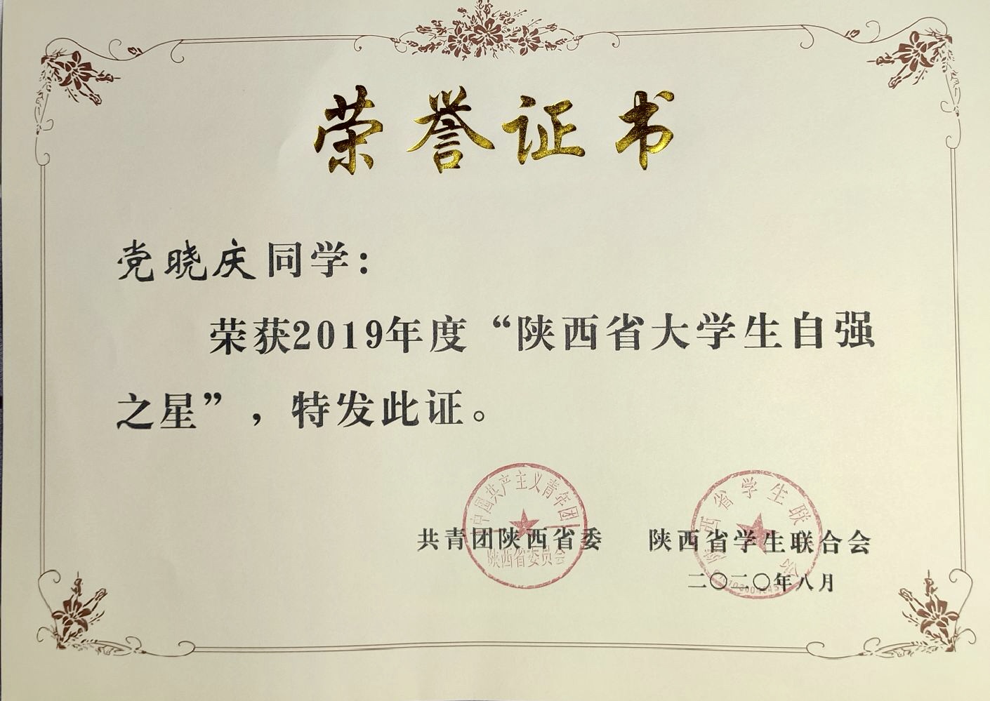 近日,团省委、省学联公布了2019年“陕西省大学生自强之星”获奖名单,我院水利工程分院党晓庆、生态环境工程分院吴明森两名学生荣获“陕西省大学生自强之星”荣誉称号。