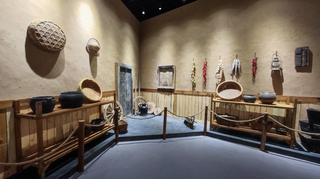 耕读体验展厅对隋代北方农家小院和古代学堂进行场景还原,其中农家小院展示的小麦、桃花、西瓜、草莓等实物均为我校科研成果。除此之外还有瓦罐、石碾、竹篮、水缸等古代农家生活用品,展现了真实的古代农家生活。