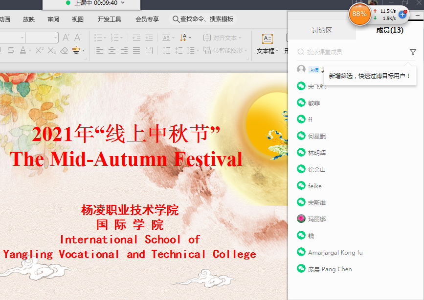 9月18日下午,在中秋节来临之际,学校针对全体国际学生举办“线上中秋节”文化活动。国际学院副院长杨雪霁、相关教师、辅导员以及全体国际学生参加了本次活动。