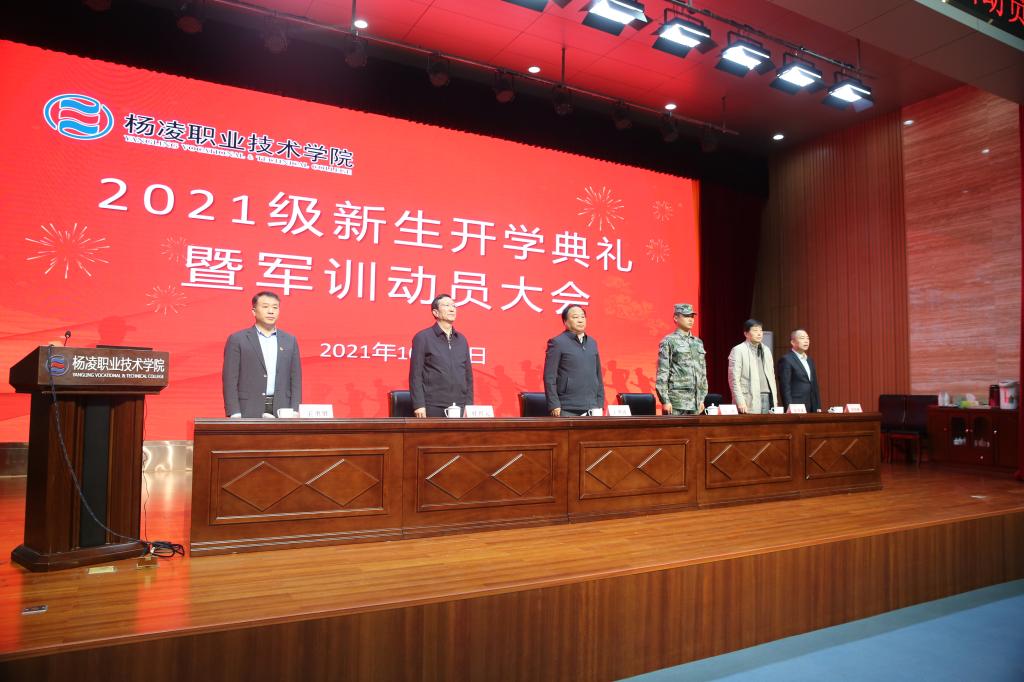 10月11日下午2:30分,伴随着庄严的国歌声,杨凌职业技术学院2021级新生开学典礼暨军训动员大会在南校区思辩堂举行。校长王周锁向军训团授旗并作开学讲话,本次军训团团长马防作军训动员讲话,党委副书记任得元,党委副书记、纪委书记王勇胜,副校长祝战斌、胡俊鹏出席大会。大会由党委副书记、纪委书记王勇胜主持。