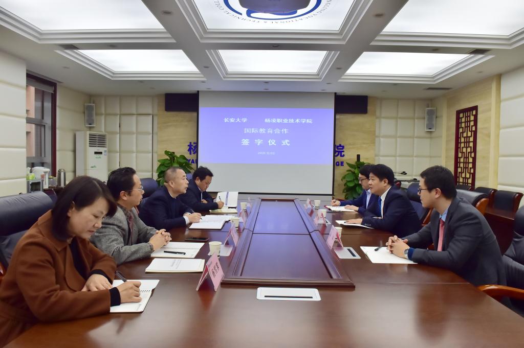 签约仪式上,胡俊鹏介绍了学校基本情况和开展国际学生教育、国际合作、建立乌兹别克斯坦现代农业技术创新示范基地和几内亚水利工程学院等情况。对长安大学支持学校国际合作工作表示感谢,希望加强与长安大学在国际学生专升本及硕士教育等方面的合作,探索本科院校与高职院校国际学生学历教育合作的新途径,并以此次为契机,进一步开展其他方面的合作与交流。