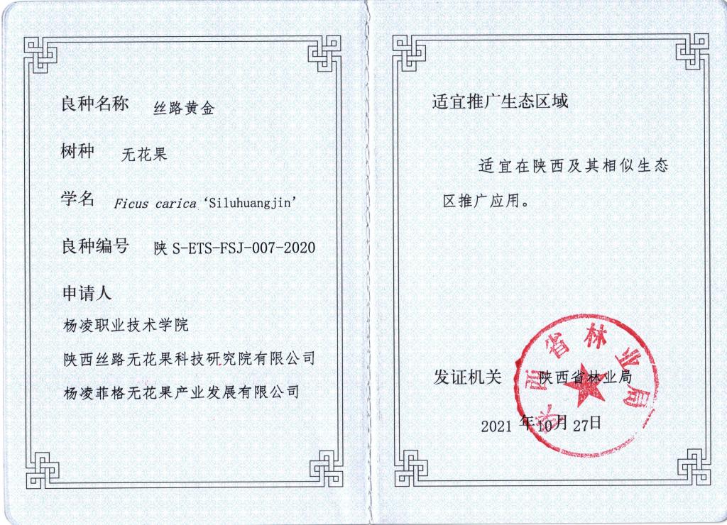“丝路红玉”、“丝路黄金”2个品种由杨凌职业技术学院作为第一单位,联合陕西丝路无花果科技研究院有限公司和杨凌菲格无花果产业发展有限公司,经过5年研究培育而成。“丝路红玉”新品种果皮紫红色、果肉浅红色,果面光洁、色泽均匀,单果重大,丰产性强,商品性极佳,鲜食特性明显优于其他品种。“丝路黄金”新品种果皮浅黄褐色、果肉浅红色、果面色泽均匀、单果重较大、含糖量高,果干的色泽更好,非常适合制干。