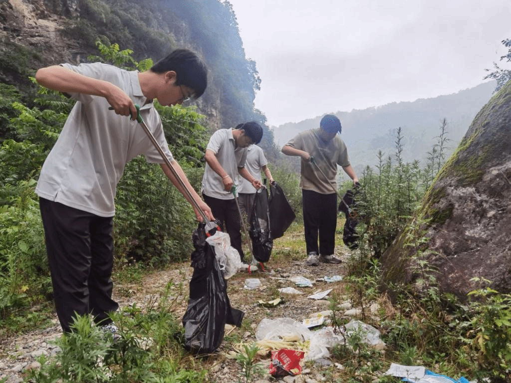 在咀头镇白云村,团队成员参观白云村史馆、乡村振兴大讲堂深刻领悟新时代党和国家在脱贫攻坚、乡村振兴事业发展上取得的伟大成就。随后,成员自备工具,沿白杨塬村太白山自然保护区后河保护站流域沿线拾级而上,捡拾路上及路旁草丛中的烟蒂、塑料纸、空瓶、果皮等十余袋。