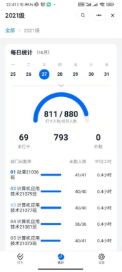 10月28日早上7:10时,早操刚刚结束,信息工程学院钉钉APP即时统计页面显示,大一学生早操出勤率为96%大二学生早操出勤率比上半年增加将近20%,该学院本学期以来实施新的早操管理制度取得明显效果。