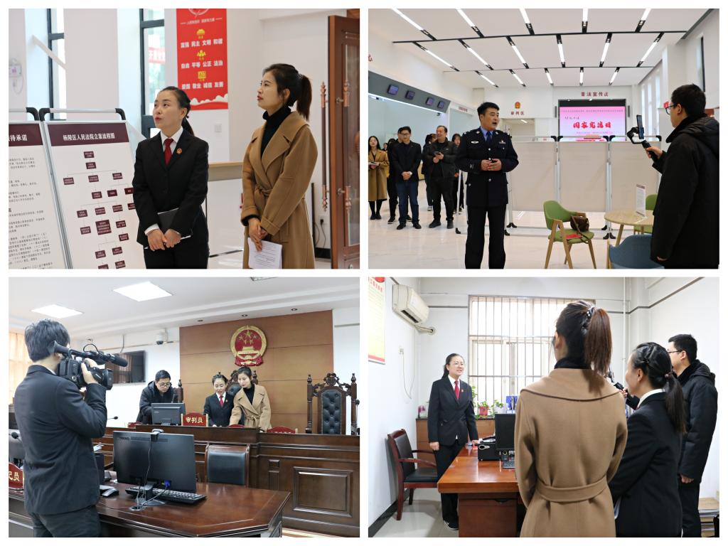 ——开展网络普法宣传活动。在124日的“国家宪法日”,联合杨陵区人民法院携手开展网络普法宣传活动。在法院负责人带领下,师生们先后参观了诉讼服务中心、法治宣传展示区、文化长廊、审判法庭和办公室等场所,通过听取讲解、实地参观和对话交流,身临其境地学习法院审判执行工作,感受浓厚的法治文化氛围。在直播环节,师生们全程观看网络直播,线上线下同步互动。随后,法院的法官干警同师生肃穆站立,手捧《宪法》和在线网友共同诵读了宪法,通过零距离感受司法,深刻体会宪法法律就在身边。