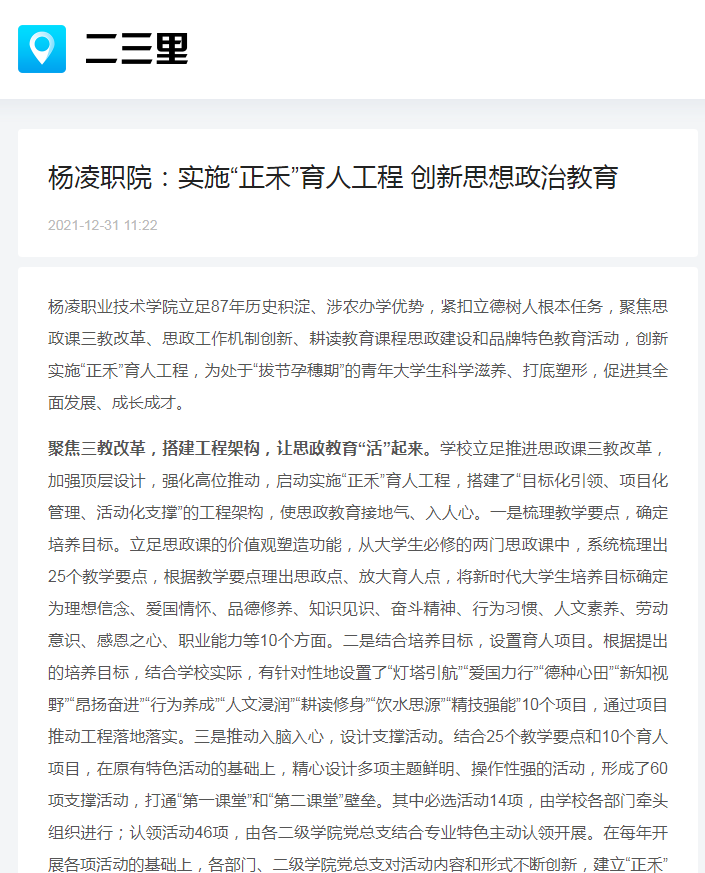 杨凌职业技术学院立足87年历史积淀、涉农办学优势,紧扣立德树人根本任务,聚焦思政课三教改革、思政工作机制创新、耕读教育课程思政建设和品牌特色教育活动,创新实施“正禾”育人工程,为处于“拔节孕穗期”的青年大学生科学滋养、打底塑形,促进其全面发展、成长成才。