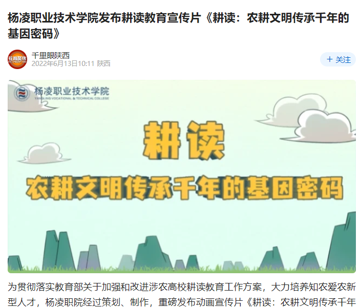 为贯彻落实教育部关于加强和改进涉农高校耕读教育工作方案,大力培养知农爱农新型人才,杨凌职院经过策划、制作、发布动画宣传片《耕读:农耕文明传承千年的基因密码》,弘扬后稷文化,构建“力耕勤读”的全方位耕读教育体系,为乡村振兴赋能助力。