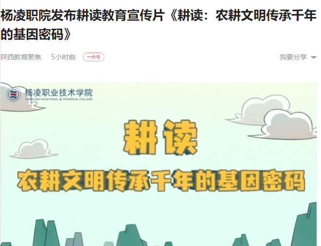 下一条:【腾讯新闻】杨凌职业技术学院发布耕读教育宣传片《耕读:农耕文明传承千年的基因密码》