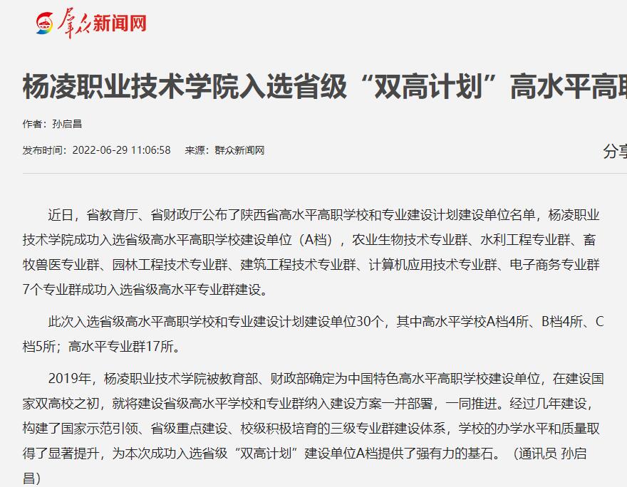 2019年,杨凌职业技术学院被教育部、财政部确定为中国特色高水平高职学校建设单位,在建设国家双高校之初,就将建设省级高水平学校和专业群纳入建设方案一并部署,一同推进。经过几年建设,构建了国家示范引领、省级重点建设、校级积极培育的三级专业群建设体系,学校的办学水平和质量取得了显著提升,为本次成功入选省级“双高计划”建设单位A档提供了强有力的基石。(通讯员 孙启昌)