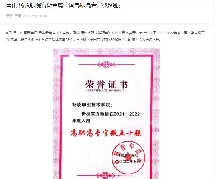 8月9日,中国青年报“青春元宇宙助力高校大思政”研讨会暨校媒精英汇在山东青岛召开。会上公布了“2021-2022年度中国大学官微百强”名单,杨凌职业技术学院官微排名第25位,再次进入全国高校官微50强行列,影响力指数持续上升。