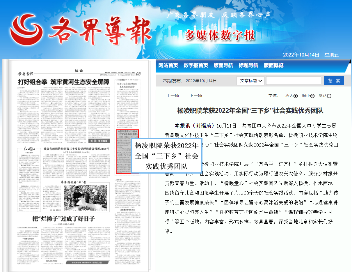 上一条:【陕西农村报】杨凌职院荣获2022年全国“三下乡”社会实践优秀团队