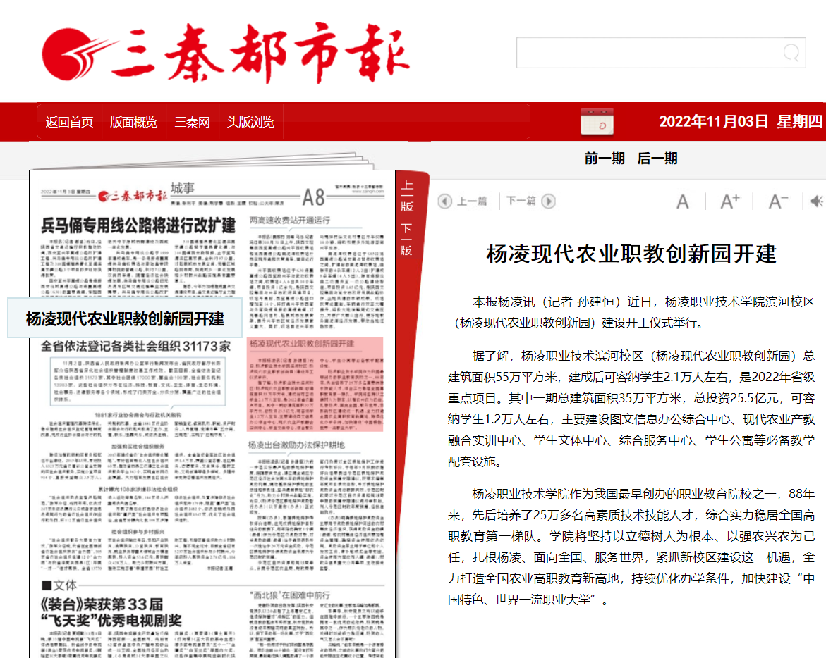 据了解,杨凌职业技术滨河校区(杨凌现代农业职教创新园)总建筑面积55万平方米,建成后可容纳学生2.1万人左右,是2022年省级重点项目。其中一期总建筑面积35万平方米,总投资25.5亿元,可容纳学生1.2万人左右,主要建设图文信息办公综合中心、现代农业产教融合实训中心、学生文体中心、综合服务中心、学生公寓等必备教学配套设施。