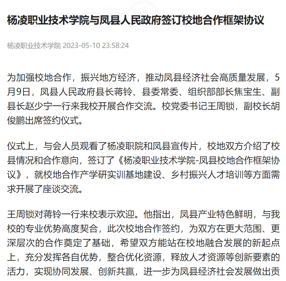 【陕西头条】杨凌职业技术学院与凤县人民政府签订校地合作框架协议