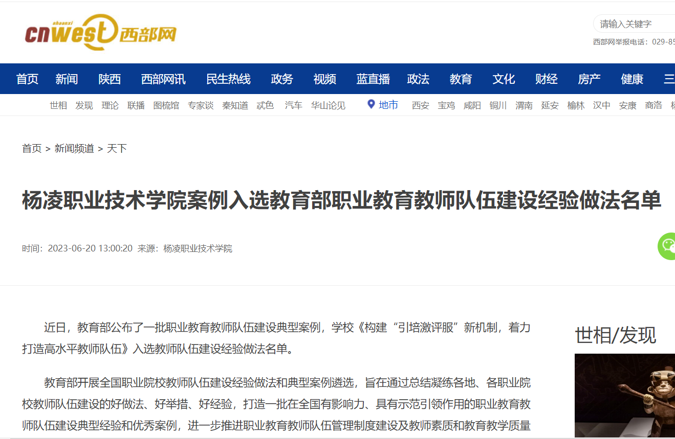 【西部网】杨凌职业技术学院案例入选教育部职业教育教师队伍建设经验做法名单