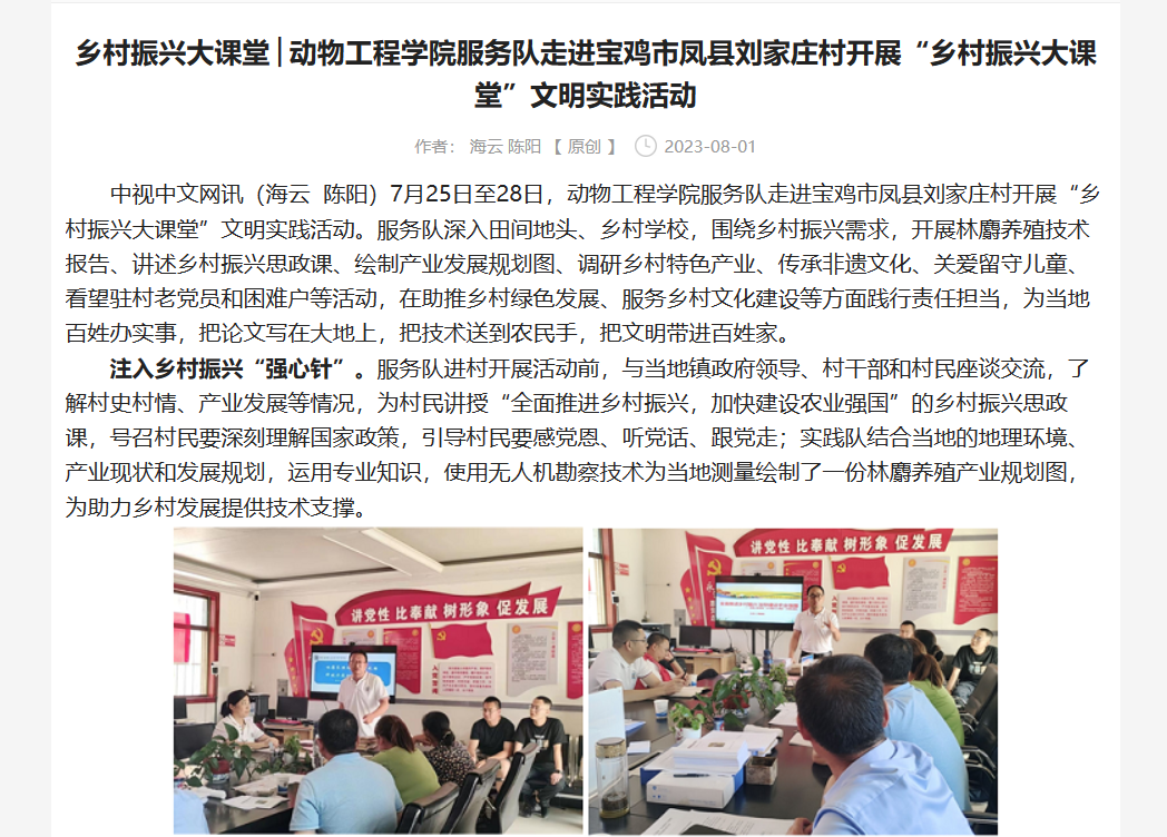 中视中文网讯(海云 陈阳)7月25日至28日,动物工程学院服务队走进宝鸡市凤县刘家庄村开展“乡村振兴大课堂”文明实践活动。服务队深入田间地头、乡村学校,围绕乡村振兴需求,开展林麝养殖技术报告、讲述乡村振兴思政课、绘制产业发展规划图、调研乡村特色产业、传承非遗文化、关爱留守儿童、看望驻村老党员和困难户等活动,在助推乡村绿色发展、服务乡村文化建设等方面践行责任担当,为当地百姓办实事,把论文写在大地上,把技术送到农民手,把文明带进百姓家。