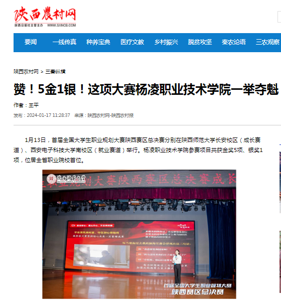 1月13日,首届全国大学生职业规划大赛陕西赛区总决赛分别在陕西师范大学长安校区(成长赛道)、西安电子科技大学南校区(就业赛道)举行。杨凌职业技术学院参赛项目共获金奖5项、银奖1项,位居全省职业院校首位。