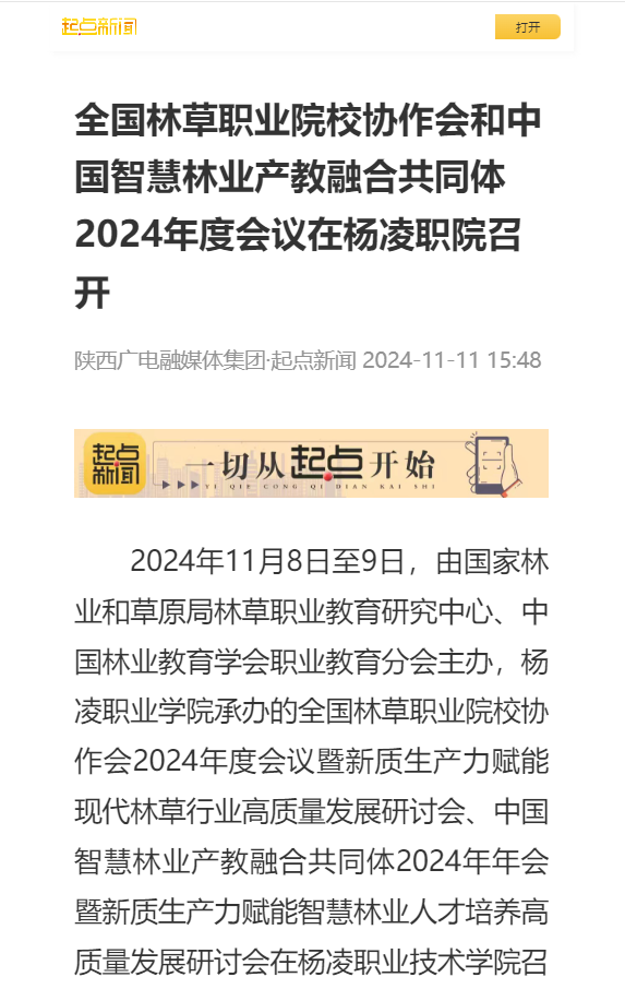 2024年11月8日至9日,由国家林业和草原局林草职业教育研究中心、中国林业教育学会职业教育分会主办,杨凌职业学院承办的全国林草职业院校协作会2024年度会议暨新质生产力赋能现代林草行业高质量发展研讨会、中国智慧林业产教融合共同体2024年年会暨新质生产力赋能智慧林业人才培养高质量发展研讨会在杨凌职业技术学院召开。本次年会的主题为“加快发展林草行业新质生产力,扎实推进林草职业教育高质量发展”。