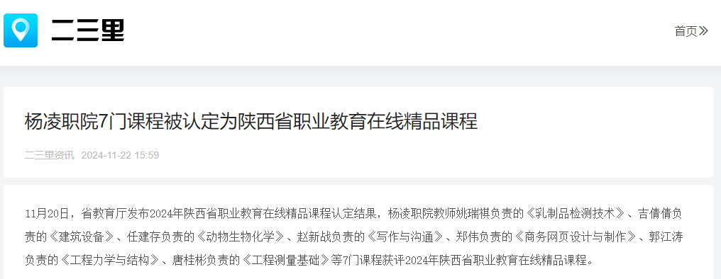 11月20日,省教育厅发布2024年陕西省职业教育在线精品课程认定结果,杨凌职院教师姚瑞祺负责的《乳制品检测技术》、吉倩倩负责的《建筑设备》、任建存负责的《动物生物化学》、赵新战负责的《写作与沟通》、郑伟负责的《商务网页设计与制作》、郭江涛负责的《工程力学与结构》、唐桂彬负责的《工程测量基础》等7门课程获评2024年陕西省职业教育在线精品课程。