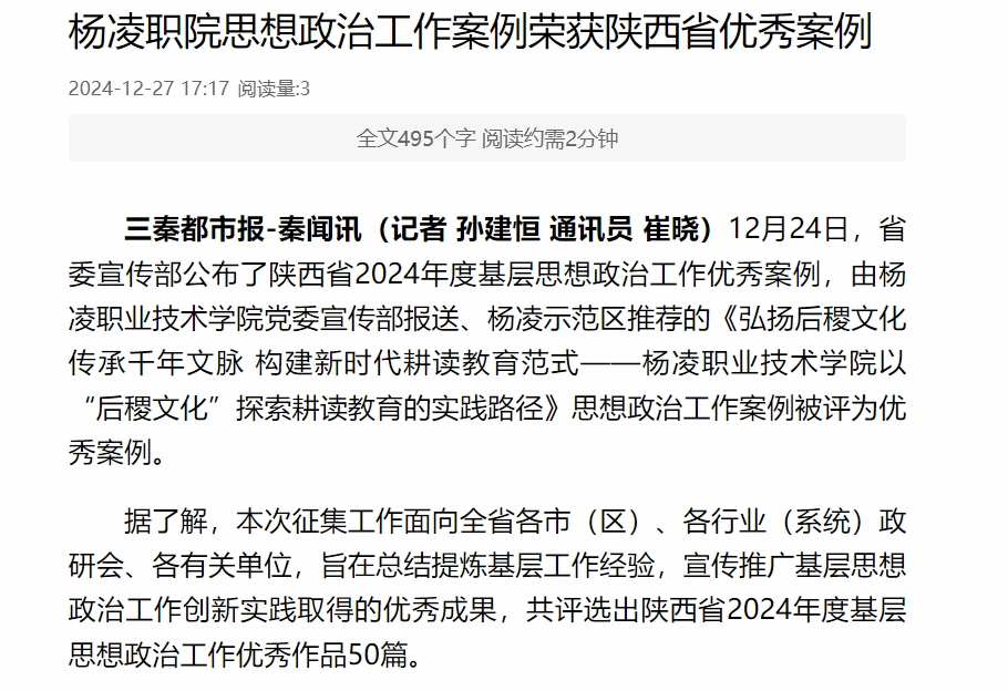 【三秦都市报】杨凌职院思想政治工作案例荣获陕西省优秀案例