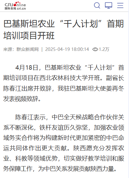 本次农业“千人计划”培训项目是落实中巴两国领导人加强农业领域合作共识的一项具体举措。首批参加培训项目的近300名学员,将在西北农林科技大学和杨凌职业技术学院,通过理论学习、实验室操作、田间实训、企业跟岗等多种形式,围绕经济作物种植、农业机械化、农业高科技应用等领域开展学习研修,并与中国师生开展文化交流活动。