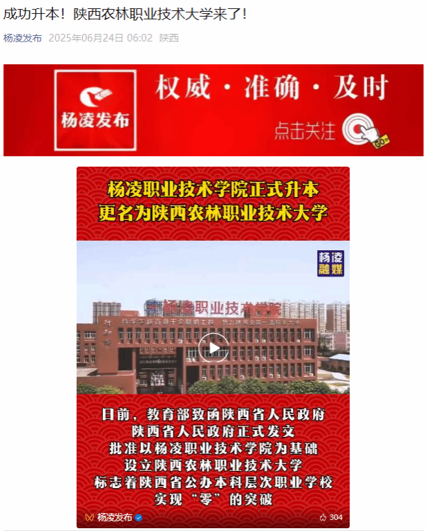 日前,教育部致函陕西省人民政府,陕西省人民政府正式发文,批准以杨凌职业技术学院为基础设立陕西农林职业技术大学。这标志着陕西省公办本科层次职业学校实现“零”的突破。