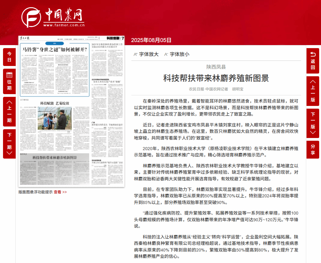 林麝养殖示范基地负责人、陕西农林职业技术大学教授牛华锋介绍,基地建立以来,主要针对传统林麝养殖繁育中过多依赖经验、缺乏科学系统理论指导的现状,对林麝双胎和泌香两大关键性能开展选育指导,有效规避了近亲繁殖问题。