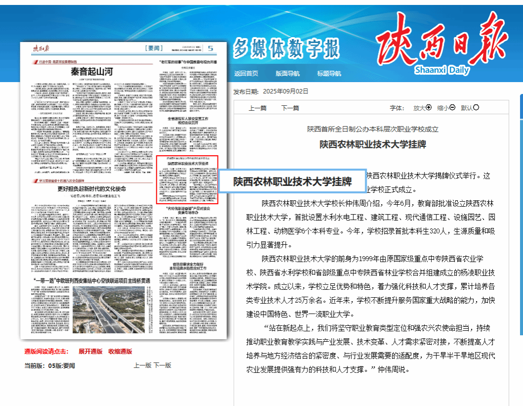 陕西农林职业技术大学校长仲伟周介绍,今年6月,教育部批准设立陕西农林职业技术大学,首批设置水利水电工程、建筑工程、现代通信工程、设施园艺、园林工程、动物医学6个本科专业。今年,学校招录首批本科生320人,生源质量和吸引力显著提升。