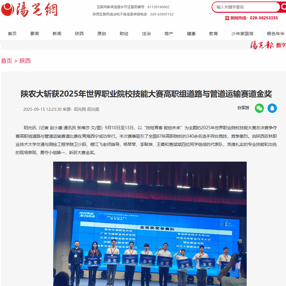 阳光讯(记者 赵小康 通讯员 张唯莎 文/图)9月10日至13日,以“技炫青春 能创未来”为主题的2025年世界职业院校技能大赛总决赛争夺赛高职组道路与管道运输赛道比赛在青海西宁成功举行。本次赛事吸引了全国87所高职院校的340余名选手同台竞技,竞争激烈。由陕西农林职业技术大学交通与测绘工程学院卫少阳、穆江飞老师指导,杨琴琴、李联坤、王蓉和查斌斌四位同学组成的代表队,凭借扎实的专业技能和出色的现场表现,勇夺小组第一,斩获大赛金奖。