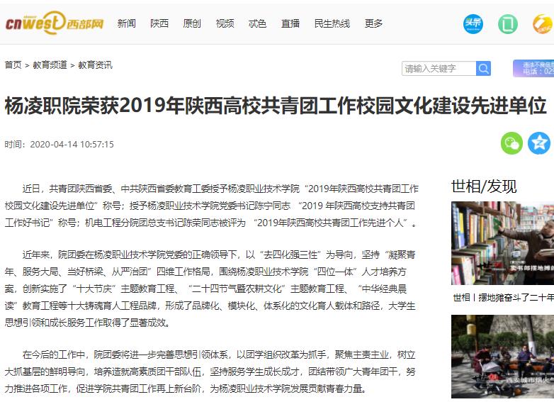 近日,共青团陕西省委、中共陕西省委教育工委授予杨凌职业技术学院“2019年陕西高校共青团工作校园文化建设先进单位”称号;授予杨凌职业技术学院党委书记陈宁同志 “2019 年陕西高校支持共青团工作好书记”称号;机电工程分院团总支书记陈荣同志被评为 “2019年陕西高校共青团工作先进个人”。