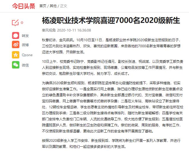 【今日头条】杨凌职业技术学院喜迎7000名2020级新生