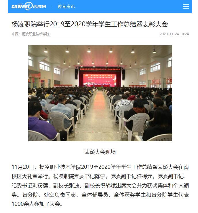 11月20日,杨凌职业技术学院2019至2020学年学生工作总结暨表彰大会在南校区大礼堂举行。杨凌职院党委书记陈宁,党委副书记任得元,党委副书记、纪委书记刘粉莲,副校长张迪,副校长祝战斌出席大会并为获奖集体和个人颁奖。各分院、处室负责同志,全体辅导员,全体获奖学生和各分院学生代表1000余人参加了大会。