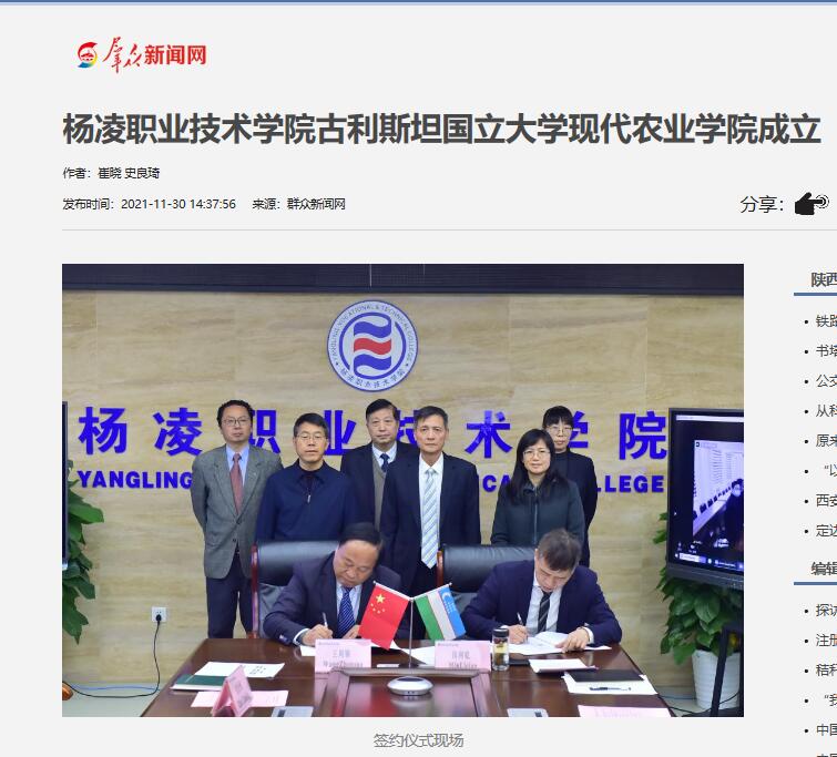11月29日下午,由杨凌职业技术学院、古利斯坦国立大学、杨凌现代农业国际合作有限公司共同合作的中国—乌兹别克斯坦农业专业教育合作项目(杨凌职业技术学院古利斯坦国立大学现代农业学院)建设合作协议签约仪式在线上举行。