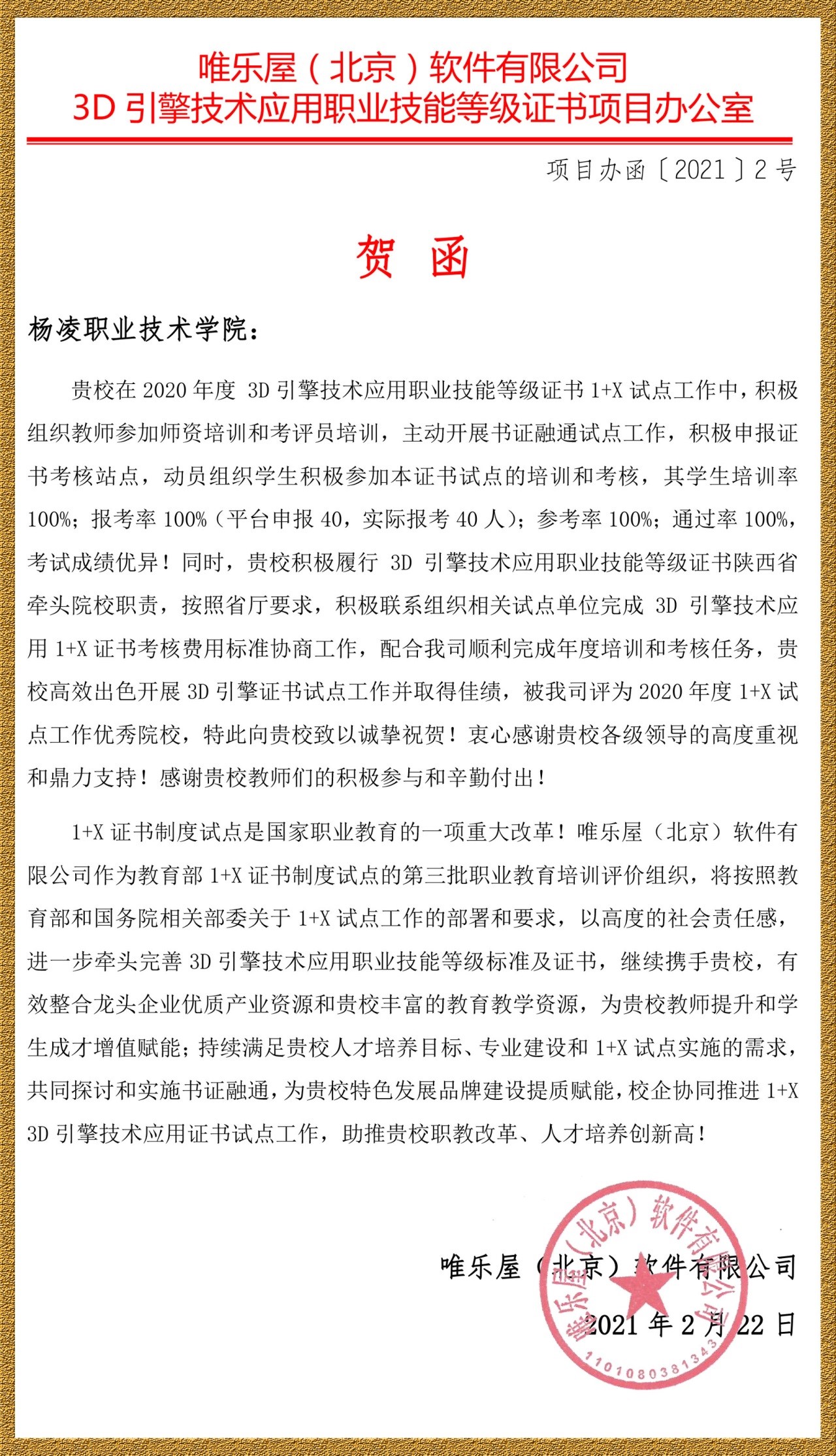 我校在2020年度1+X 3D引擎证书试点工作中表现出色,成绩优异,荣获“优秀院校”殊荣!在我校相关部门、信息工程学院领导和相关教师的共同努力下,圆满完成了2020年1+X 3D引擎技术应用职业技能等级证书试点工作,我校被省厅指定为“3D引擎证书1+X试点陕西省牵头学校”。在2021年,我们将按照教育部关于1+X试点工作的部署和要求,认真履行牵头院校职责,与企业共同进一步完善职业技能等级标准,探讨和实施书证融通,争取在该项工作中再创佳绩!