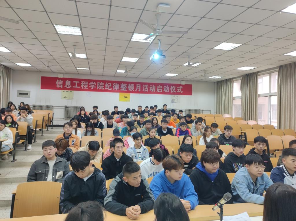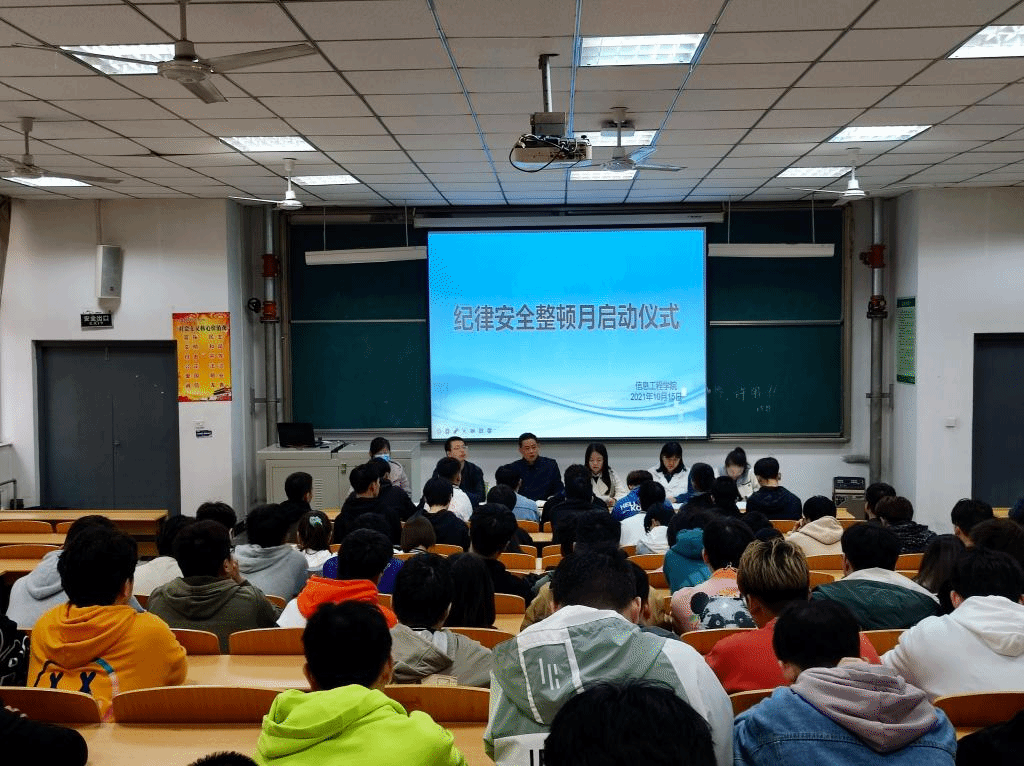 为了进一步落实立德树人目标,提高学生的安全观念,增强学生自律守纪意识,促进学生养成良好的生活习惯和学习习惯,进而构建优良班风校风,提高学院育人质量。信息工程学院于2021年10月15日下午4点在醒钟楼NOB-201举办了“2021年信息工程学院纪律整顿月活动启动仪式”,信息工程学院学工办主任任争峰、全体辅导员以及各班班干部、学生会成员参加了此次会议。
