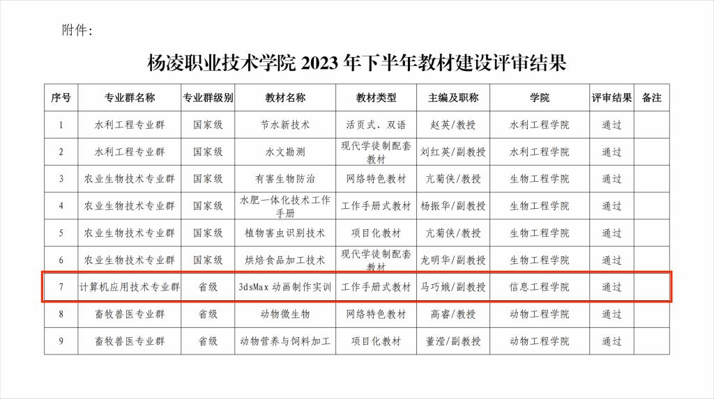 4月3日,杨凌职业技术学院院长办公室公布了2023年下半年双高教材建设评审结果,信息工程学院教师马巧娥副教授的《3dsMax动画制作实训》教材经学校教材建设委员会专家评审通过。