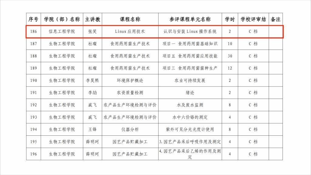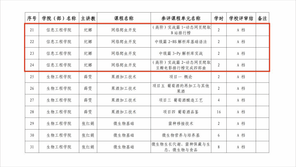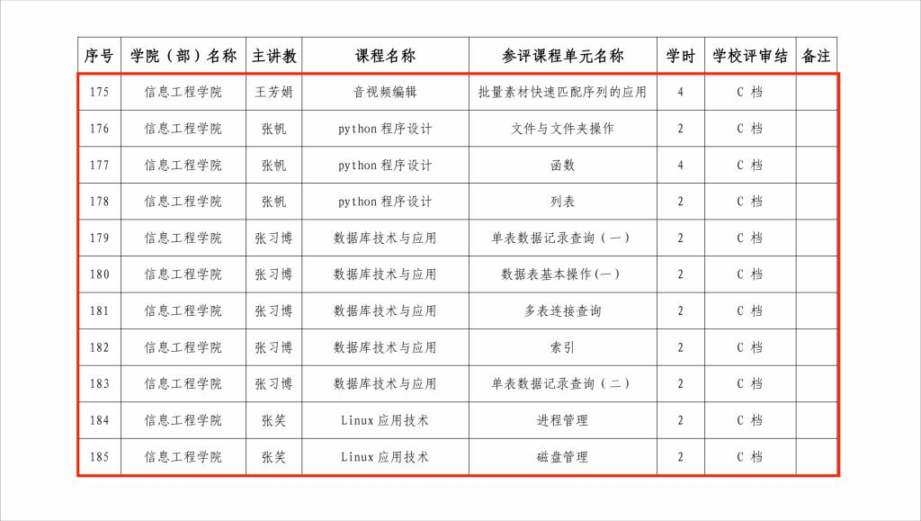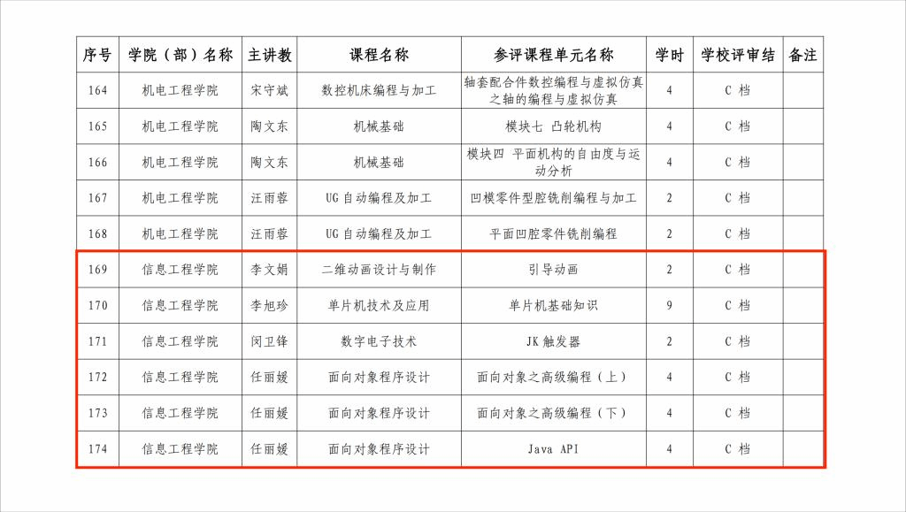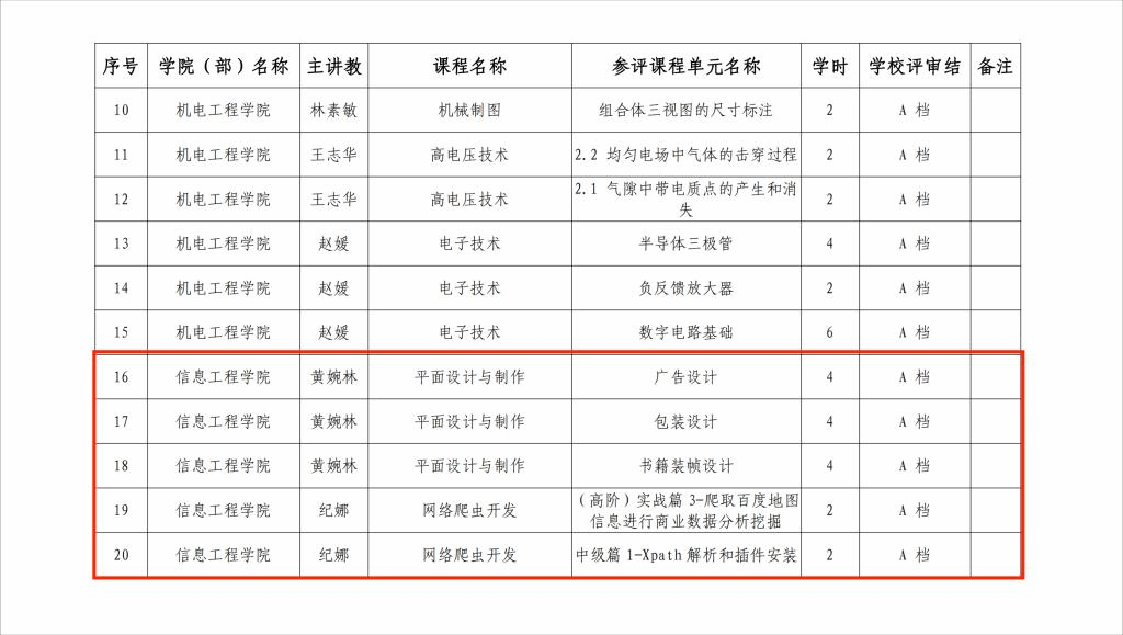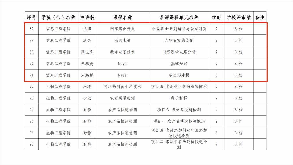 4月15日,杨凌职业技术学院2023年下半年校级“单元金课”评审结果公布,信息工程学院40个“单元金课”评审通过,其中A档9个,B档13个,C档18个。
