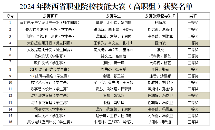 6月3日,陕西省教育厅办公室发布《陕西省教育厅办公室关于公布2024年陕西省职业院校技能大赛获奖名单的通知》(陕教职办〔2024〕13号),信息工程学院共获奖16项,其中一等奖4项,二等奖6项,三等奖6项。