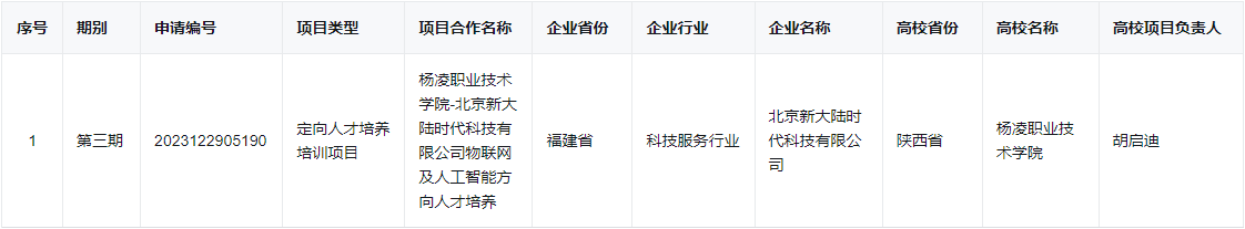 6月14日,教育部高校学生司发布《关于公布第三期供需对接就业育人项目立项名单的通知》(教就业司函〔2024〕23号),信息工程学院与北京新大陆时代科技有限公司联合申报的定向人才培养培训项目以及信息工程学院与西安四叶草信息技术有限公司联合申报的就业实习基地项目分别获得立项。