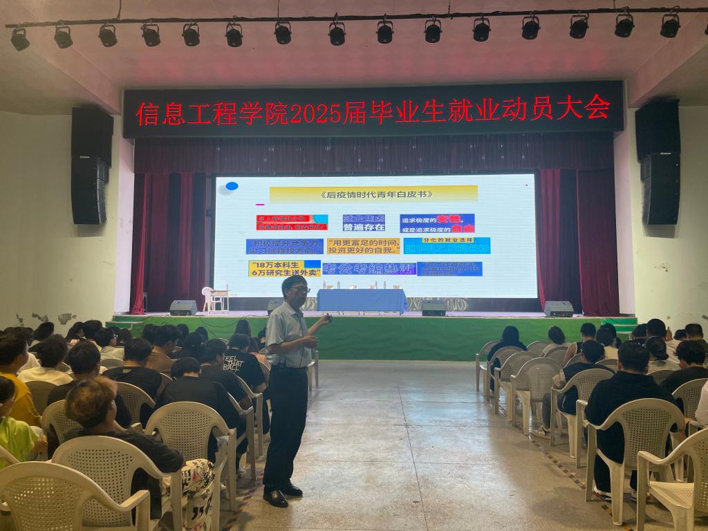 为帮助我院2025届毕业生更好地规划职业发展,提升就业竞争力,信息工程学院于2023年9月23日在学校一卡通中心召开2025届毕业生就业动员大会,学校招就处处长李岩、学院党总支副书记吴高潮、院长陈高锋、学生工作办公室主任任争峰、就业辅导员王昊宇、李宣荣出席大会,2025届全体毕业生参加。动员大会由学院院长陈高锋主持。