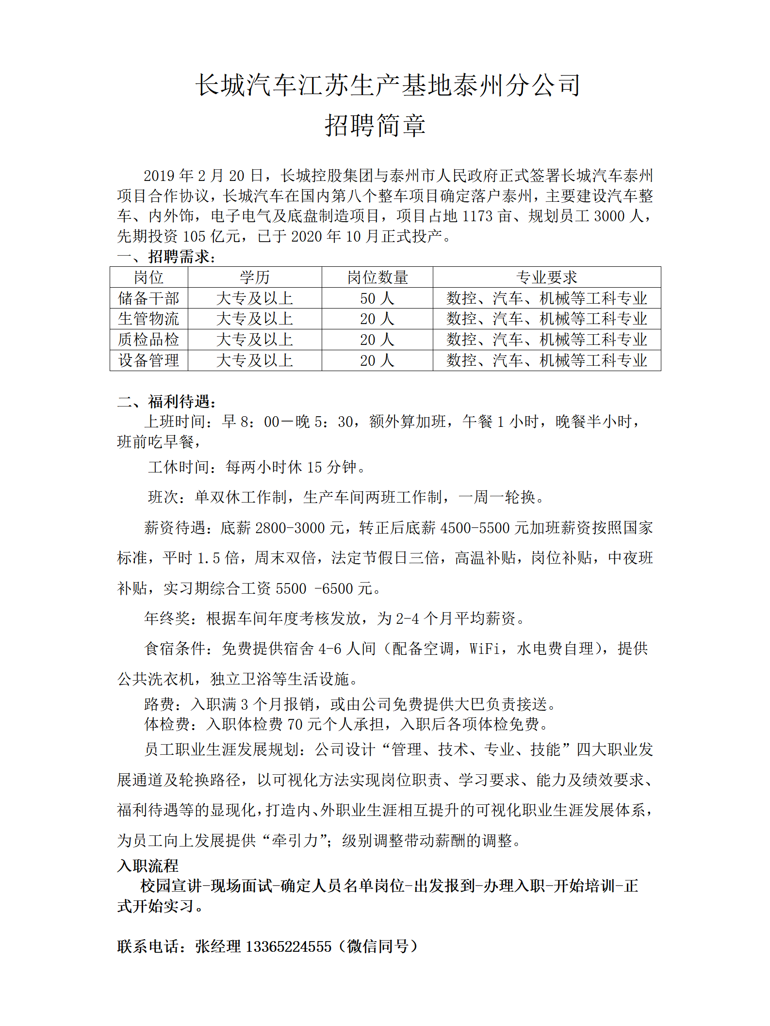 【招聘信息】长城汽车江苏生产基地泰州分公司招聘简章