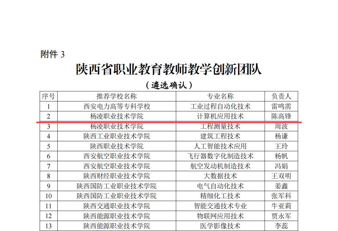2月14日,陕西省教育厅发布《陕西省教育厅关于公布陕西省职业教育教师教学创新团队建设名单的通知》(陕教函〔2025〕92 号),我院由陈高锋教授领衔的计算机应用技术团队入选省级职业教育教师教学创新团队立项建设单位。