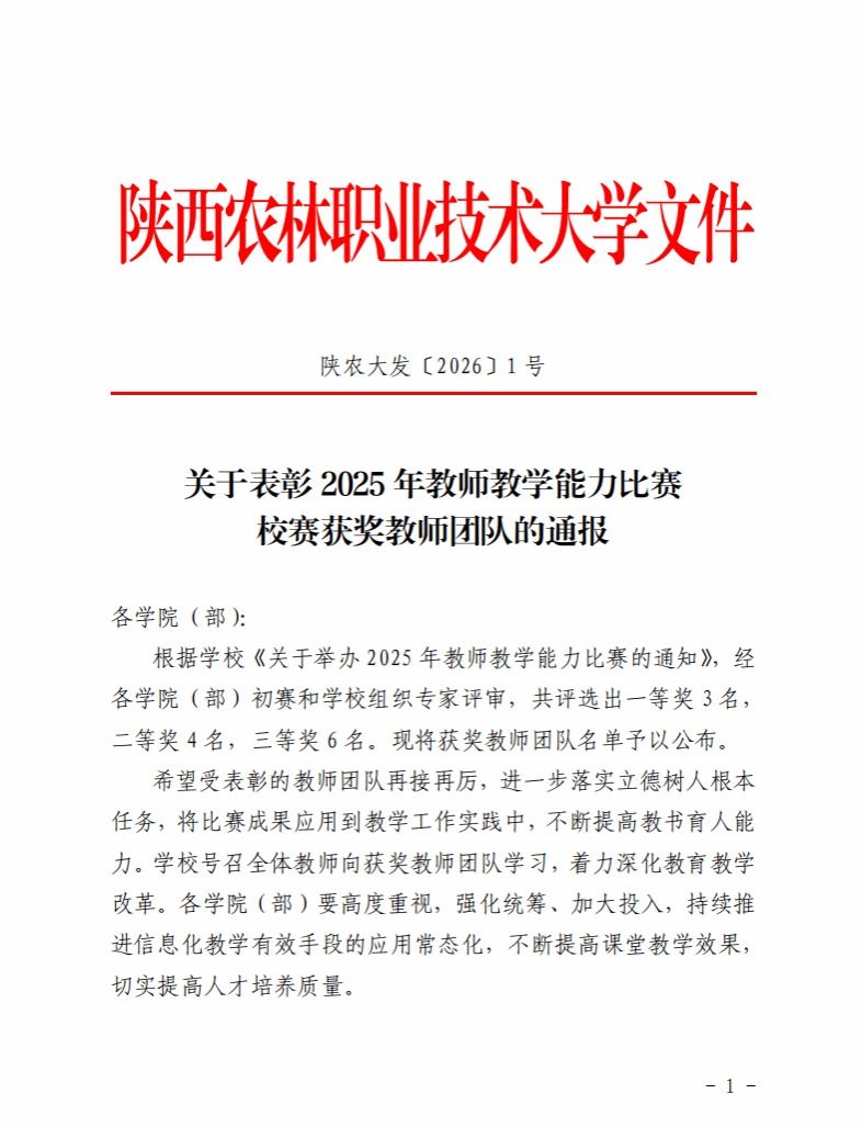 近日,学校发布《关于表彰2025年教师教学能力比赛校赛获奖教师团队的通报》(陕农大发〔2026〕1号),对在比赛中表现突出的教学团队予以表彰。由我院纪娜、岳超刚、张笑三位教师组成的教学团队,凭借参赛作品《网页数据采集、存储与可视化》,荣获本次教师教学能力比赛校级三等奖。