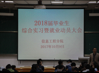 为进一步做好2018届毕业生顶岗实习及就业工作,2017年10月9日下午4:00,信息工程分院在醒钟楼NOB-107教室召开了“2018届毕业生综合实习暨就业动员大会”。分院党总支书记高掌平、两办相关人员以及300多名毕业生参加了本次动员会。
