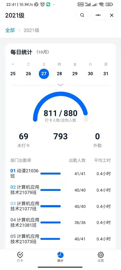 10月29日早7:10时,早操刚刚结束,钉钉APP即时统计页面显示,我院大一学生早操出勤率为96%,大二学生早操出勤率也增加将近20%。 为高效、快速、低出错率的管理早操出勤情况,信息工程学院本学期建立了“学生+学生会+辅导员+班主任”四级联动网格化管理机制,利用钉钉打卡全面实现学生管理的信息化。
