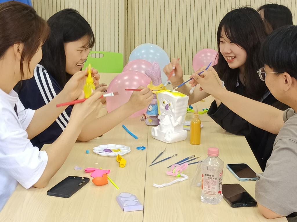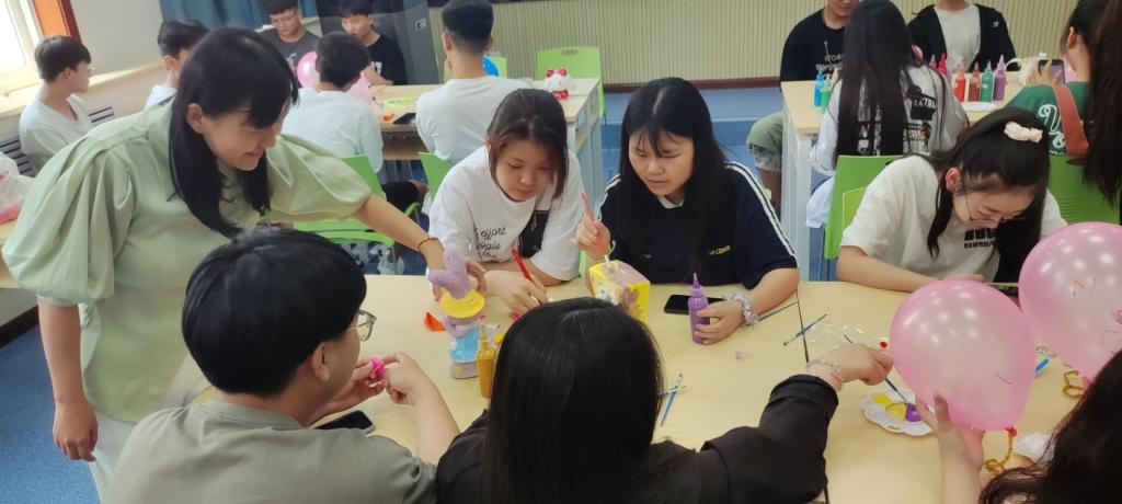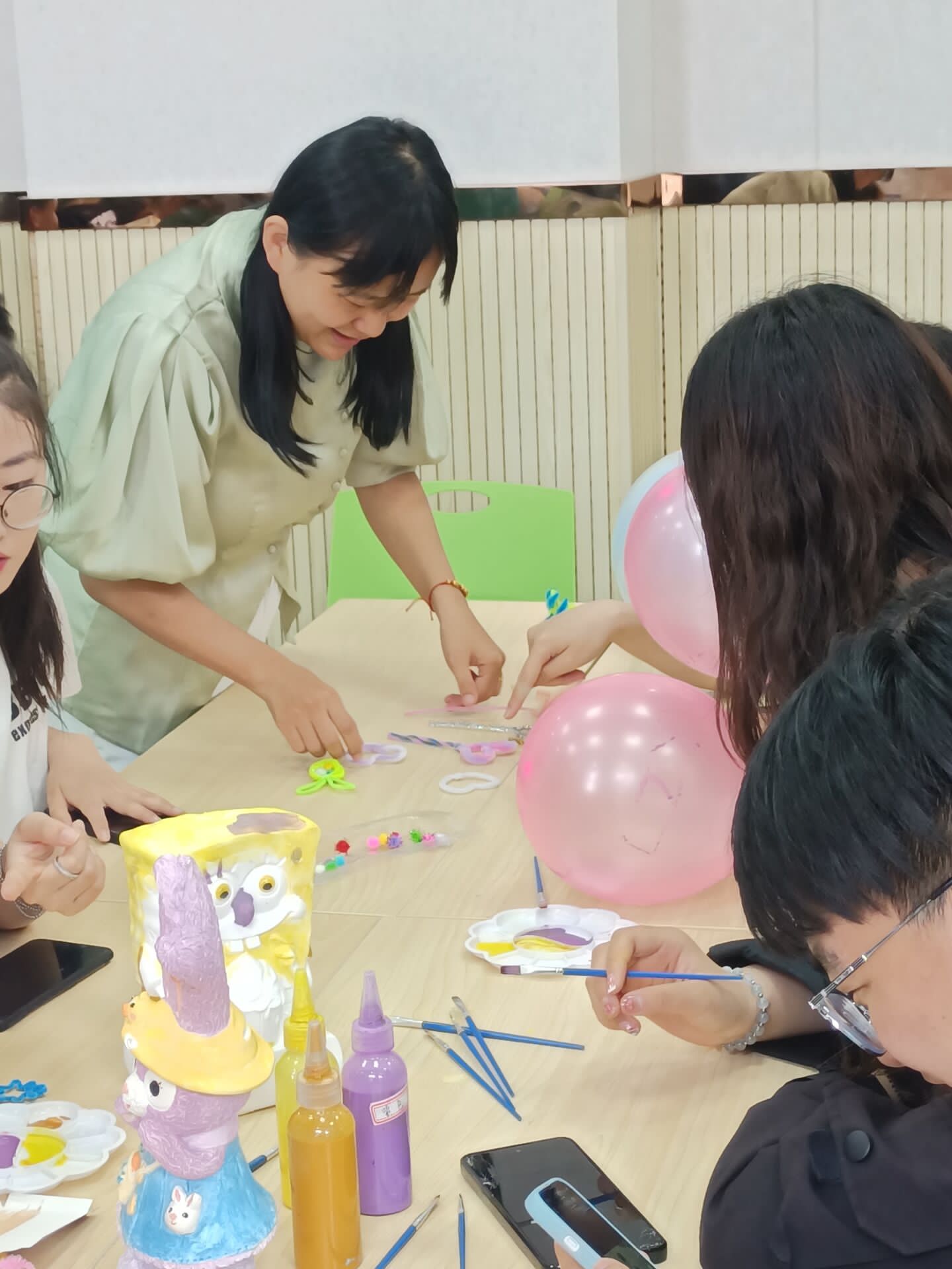 活动中同学们被随机分为三个小组团队,随后进行了气球表情涂画、石膏娃娃涂鸦、拼装花朵等各类小游戏,整个活动过程,同学们互相配合交流,取长补短,在互动的同时学会了互相尊重理解沟通。