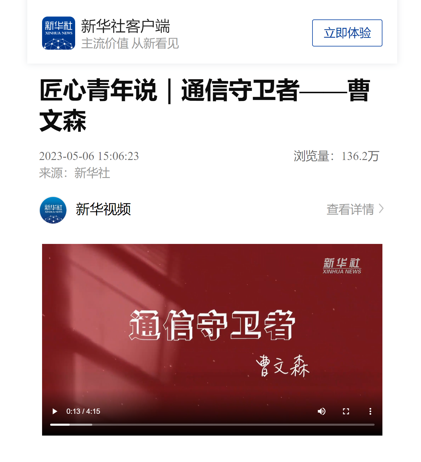 近日,新华社专题报道《匠心青年说|通信守卫者——曹文森》。我校信息工程学院现代通信技术毕业生曹文森,干一行、爱一行、专一行,精益求精、坚毅执着,用行动诠释新时代“青年工匠”。